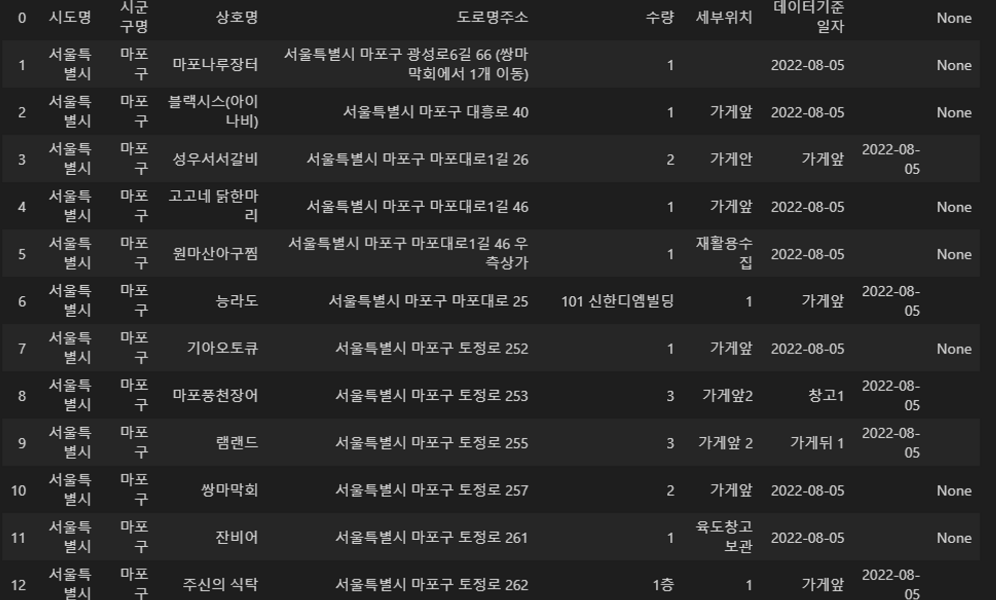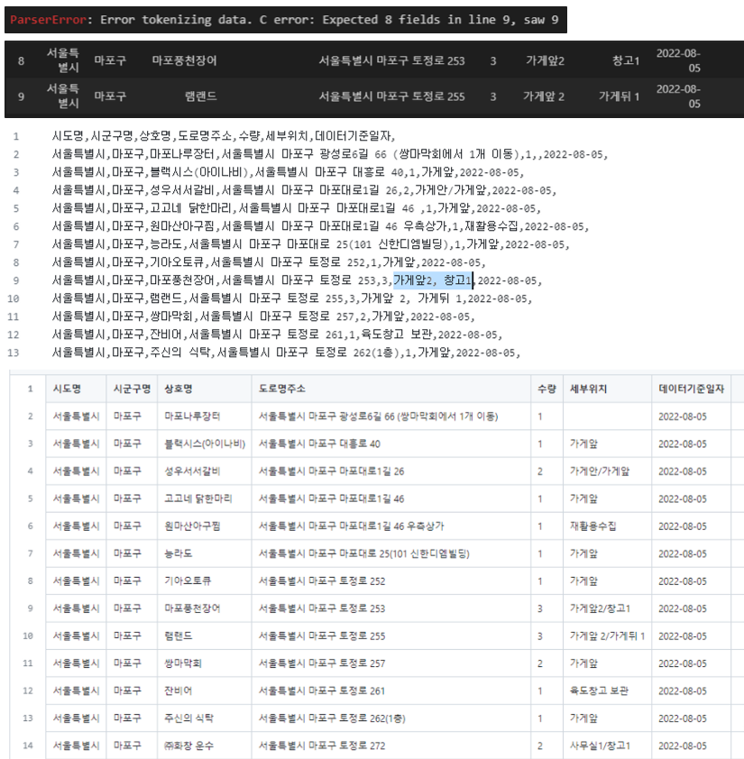 2. 8, 9번 인덱스 값을 확인해봄. 8번의 가게앞2, 창고1과 9번의 가게앞 2, 가게뒤 1가 각기 다른 컬럼으로 들어가있음