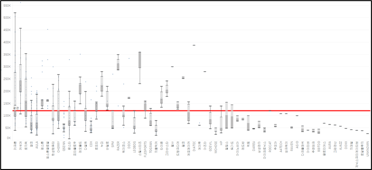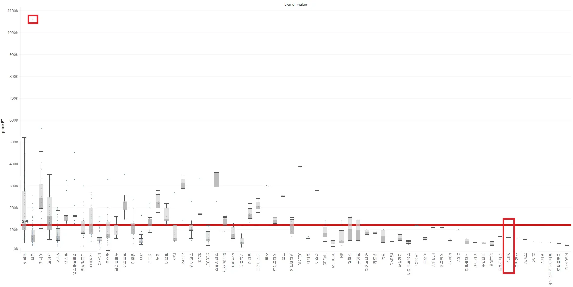 · 키크론이란 브랜드의 1,059,900원이라는 금액 이상치 확인하기