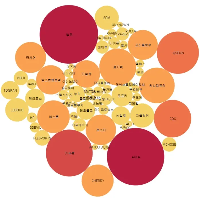 · 4순위 : 로지텍(40건), 한성컴퓨터(37건), 엠스톤(31건), CHERRY(30건), 커세어(28건), 몬스타(27건), 프리플로우(26건), 엠스톤글로벌(25건), 다얼유(22건)