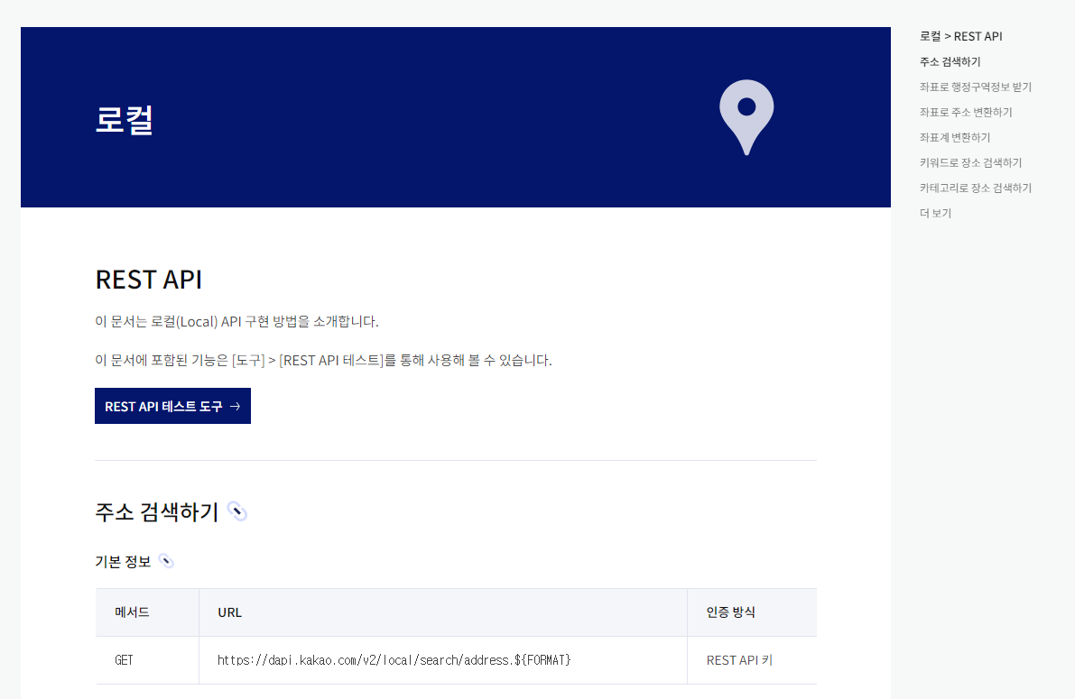 카카오맵API를 검색하면, https://apis.map.kakao.com/web/guide/ 해당 사이트가 나오고, 이 사이트는 자바스크립트 API이므로 파이썬 코드를 사용하는 나로서는 이해하기가 쉽지 않다. 파이썬 코드들은 아래 주소의 로컬 > REST API 페이지를 보는게 이해에 도움이 된다. 카카오 developers의 로컬 > REST API 를 사용해서, 주소 검색, 좌표로 주소 변환, 좌표계 변환 등을 할 수 있다.(스크린샷의 우측 목차 참고)
