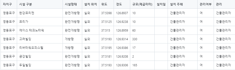영등포구의 흡연시설은 위도, 경도는 존재하지만 주소컬럼은 존재하지 않는다.