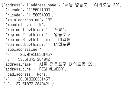 현재 경우에는 주소를 불러오고 싶을 때 주소가 할당 된 results[0]의 ['address']의 ['address_name']을 가져오게 설정했지만, 결과값과 가져오고 싶은 값에 따라서 results[0]['road_address']['address_name'] 등 변경이 필요할 때가 있다.