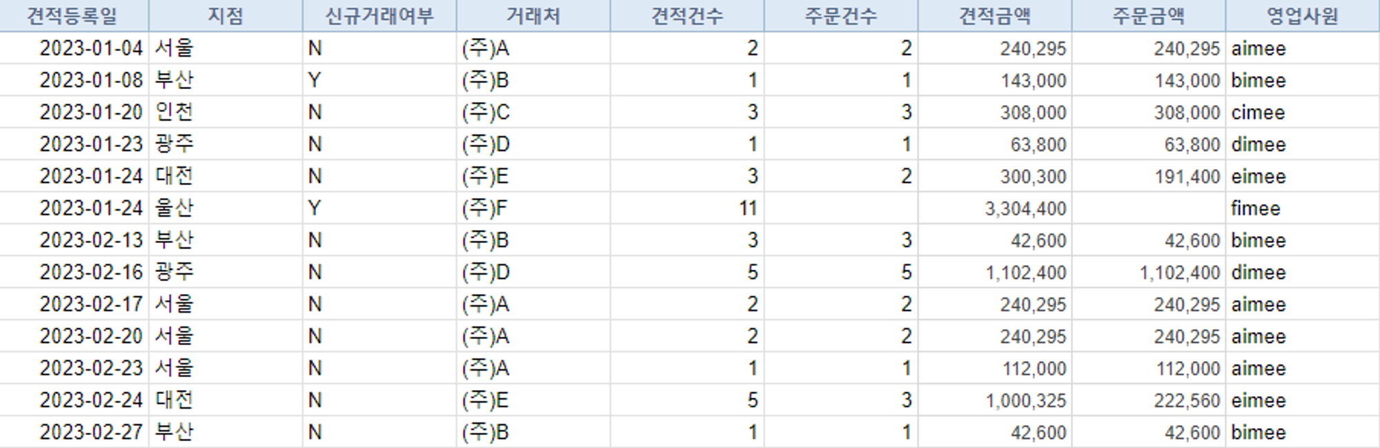- 견적주문 데이터에서 활용할 수 있는 컬럼은 ‘지점’, ‘거래처명’, ‘견적건수’, ‘주문건수’, ‘견적금액’, ‘주문금액’, ‘등록자’일 것 같다. 데이터가 무겁기 때문에(1개년만 해도 30만건 정도), 해당 컬럼을 기준으로 간소화된 데이터를 뽑는다.