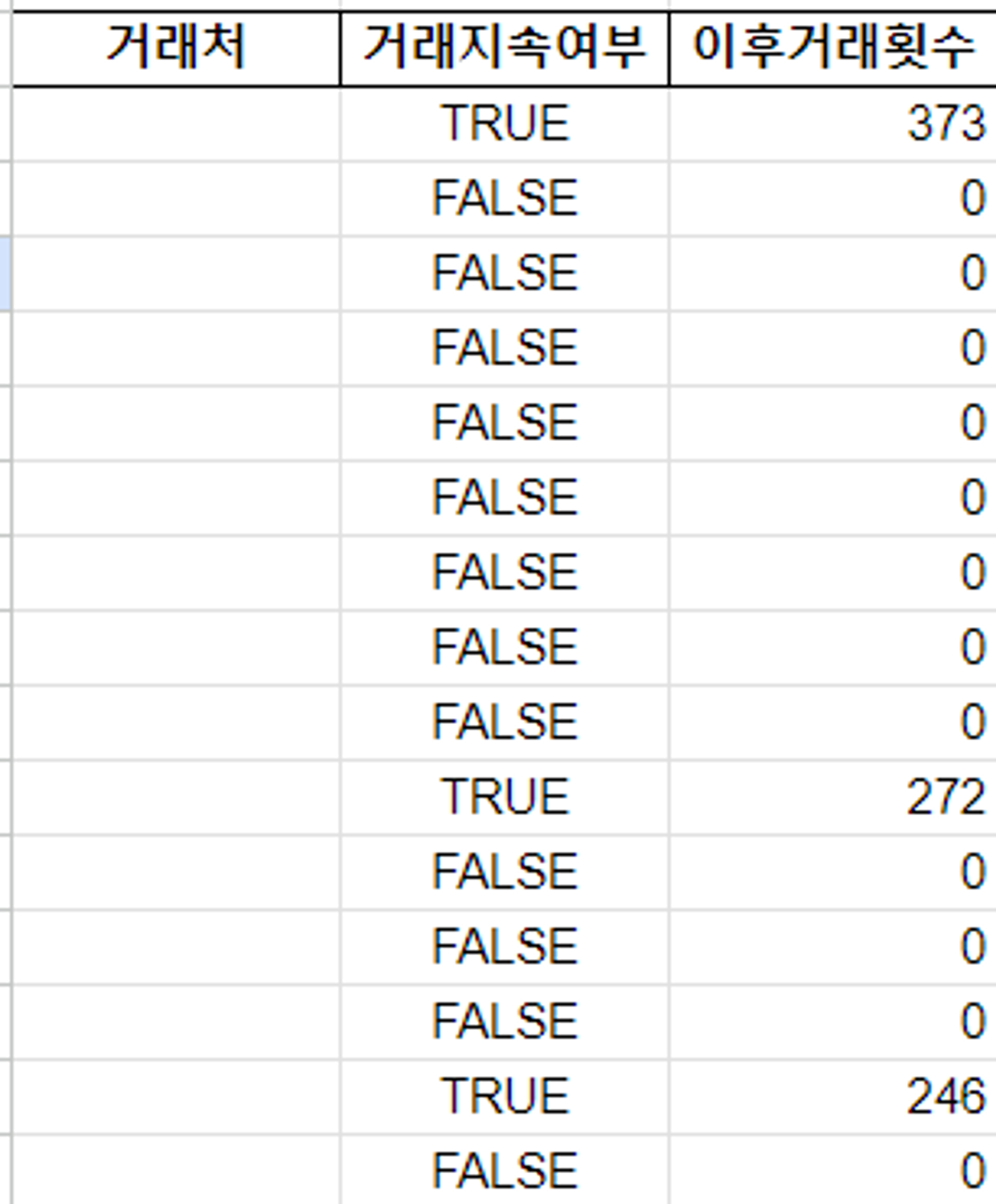 result_df = result_df.append({'거래처':trader, '거래지속여부':num_ongoing_deals>0, '이후거래횟수':num_ongoing_deals}, ignore_index=True)