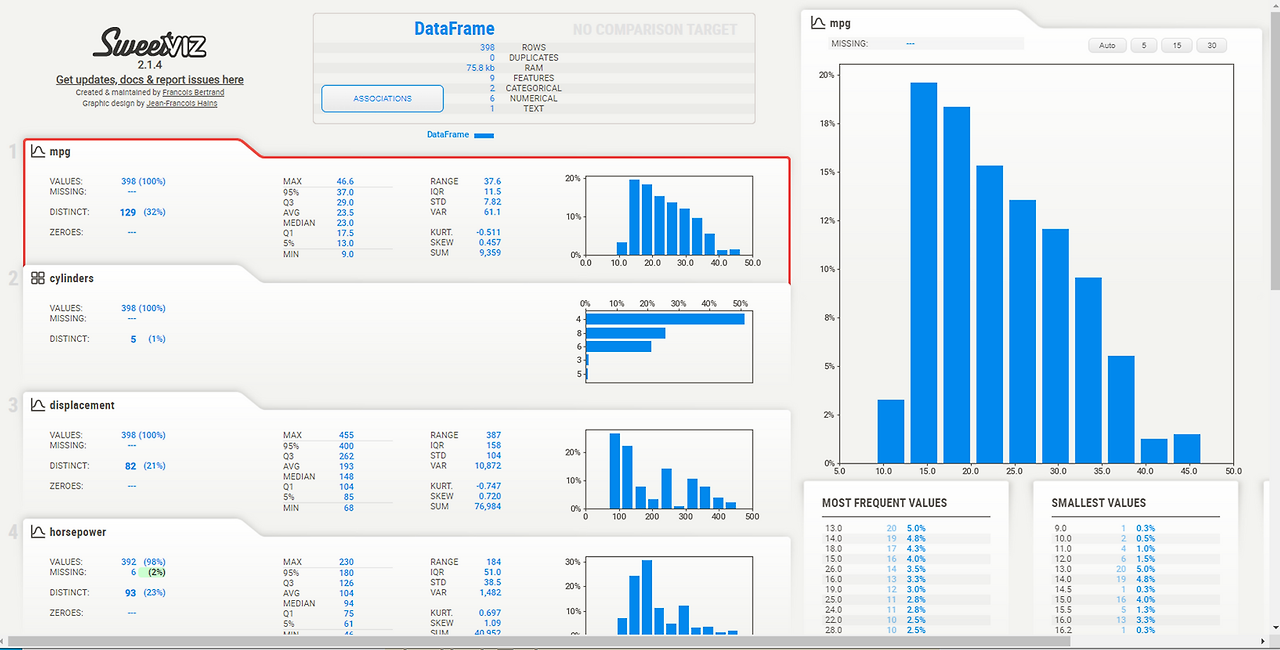 추상성이 있다는 것은 파이썬으로 감싸서 간단하게 만들어줬다는 뜻입니다. Pandas-profiling, sweetviz, autoviz 는 모두 짧은 코드로 기본적으로 봐야 하는 기술통계 값을 시각화합니다. 이렇게 편리한 추상화 도구들이 있지만, 직접 시각화를 하고 기술통계를 구하는 이유는, 대용량 데이터에 사용하기 어렵다는 단점 때문입니다. 아래는 df=sns.load_dataset("mpg")코드로 mpg 데이터셋을 df라는 변수에 담아 시각화 보고서를 만든 예시들입니다.