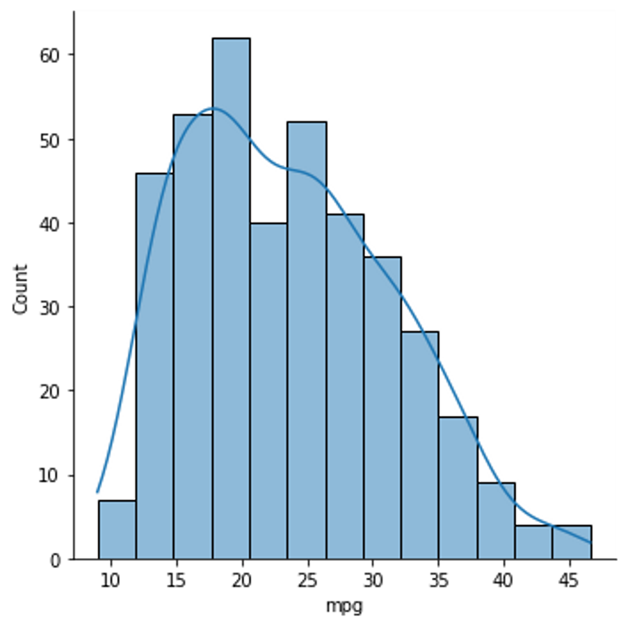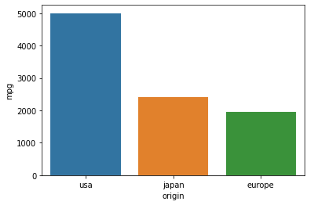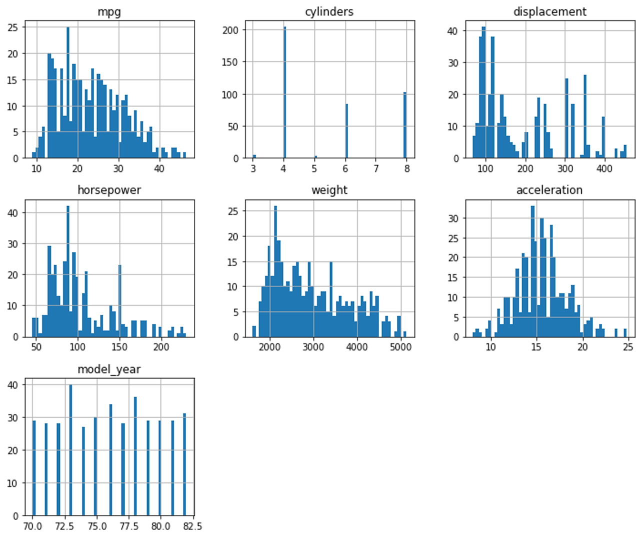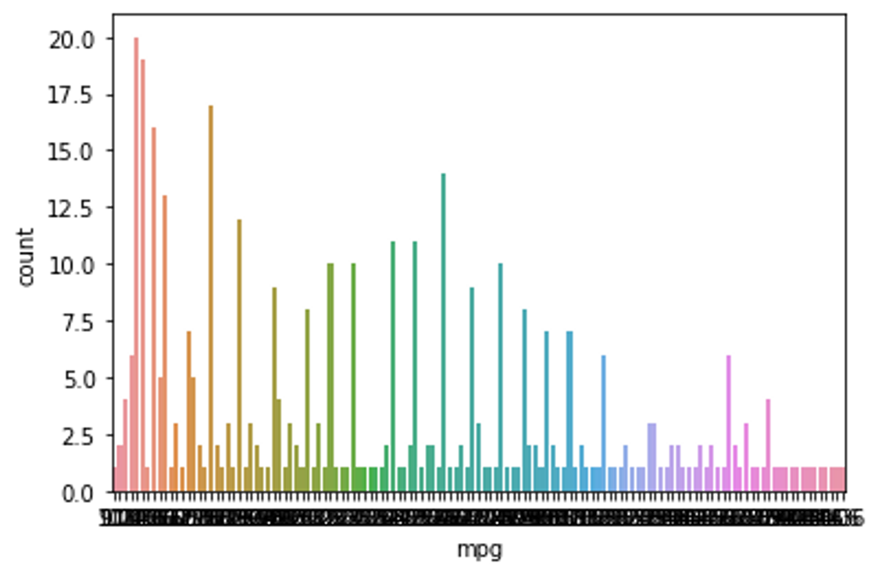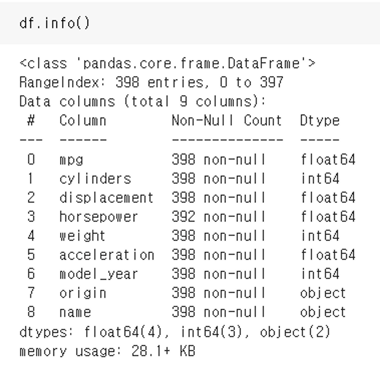 mpg : 연비 / cylinders : 실린더 개수 / displacement : 배기량 / horsepower : 마력 / weight : 무게 / acceleration : 엔진이 초당 얻을 수 있는 가속력 / model_year : 출시 년도 / origin : 제조 장소(미국USA, 유럽EU, 일본JPN), name : 자동차 이름