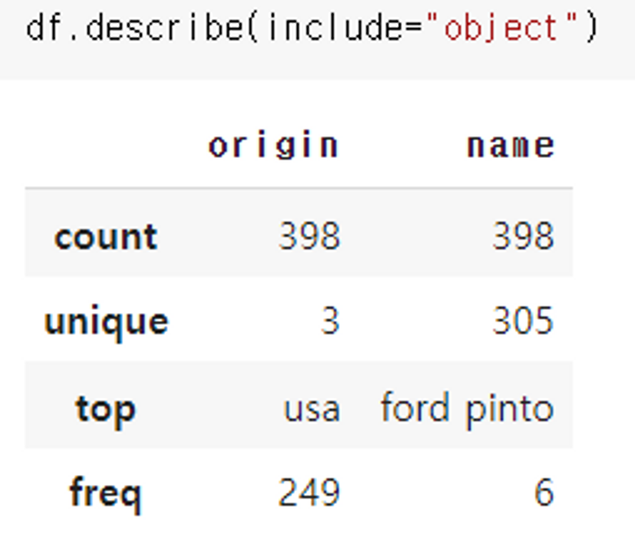 이유는, 두 컬럼 모두 양적인 개념이 아니고, 연산이 의미가 없는 데이터이기 때문입니다. 이처럼, 수치형인지 범주형인지 헷갈린다면 전체 히스토그램을 그려서 시각화 해보거나, 유니크 값이 몇 개(cylinders는 유일값이 5개인 변수)가 되는지 확인하는 방법으로 범주형인지 수치형인지를 확인합니다.