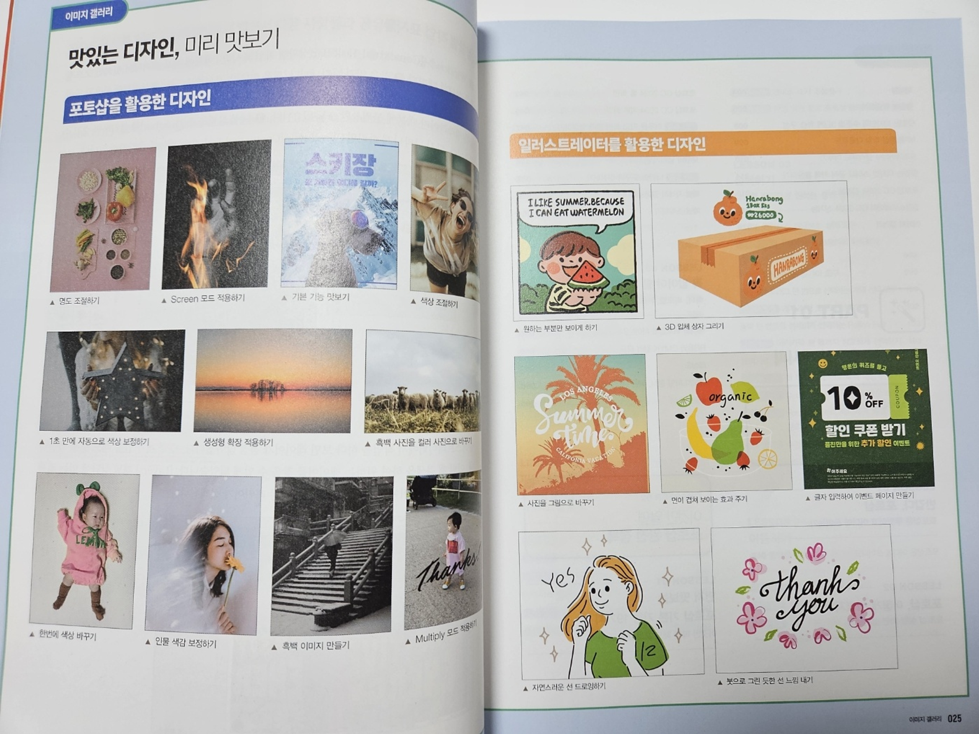 책 앞부분에는 ‘맛있는 디자인, 미리 맛보기’라는 페이지가 있습니다. 포토샵과 일러스트레이터 책을 샀을 때, ‘난 이런 걸 구현해보고 싶어’라는 막연한 선호도가 있잖아요? 이 페이지에서 내가 구현할 수 있는 최종 결과물을 확인해보고, 관심 있는 파트를 먼저 찾아볼 수 있는 부분이 좋았어요.