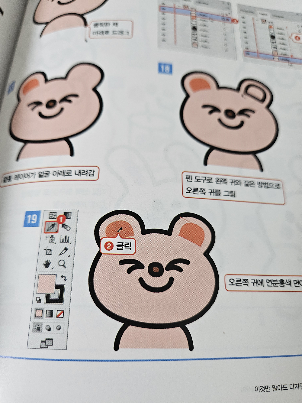 일러스트레이터에서는 그림을 직접 그려보고 싶었습니다. 그래서 마우스 만으로 캐릭터를 그릴 수 있다는 것이 정말 재미있었어요. 또 스케치 파일이 있어서 처음에는 따라해보며 펜 도구나 색상 채우기를 익히고, 그 다음에는 스케치 파일 없이 그리고 싶은 것을 연습해보기도 했습니다.