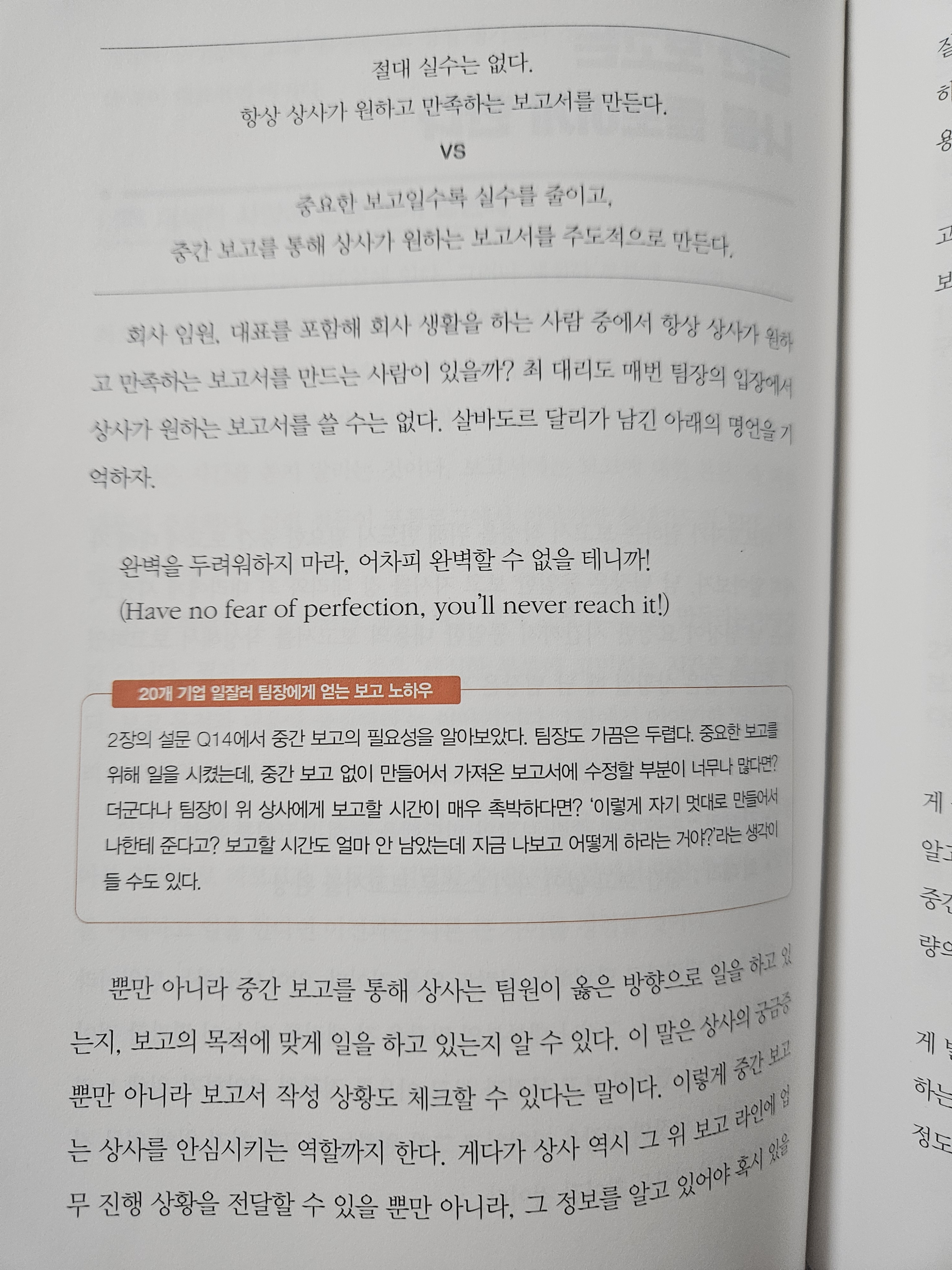 p.178 중간 보고를 통해 상사는 팀원이 옳은 방향으로 일을 하고 있는지, 보고의 목적에 맞게 일을 하고 있는지 알 수 있다. 이 말은 상사의 궁금증 뿐만 아니라 보고서 작성 상황도 체크할 수 있다는 말이다. 이렇게 중간 보고는 상사를 안심시키는 역할까지 한다.