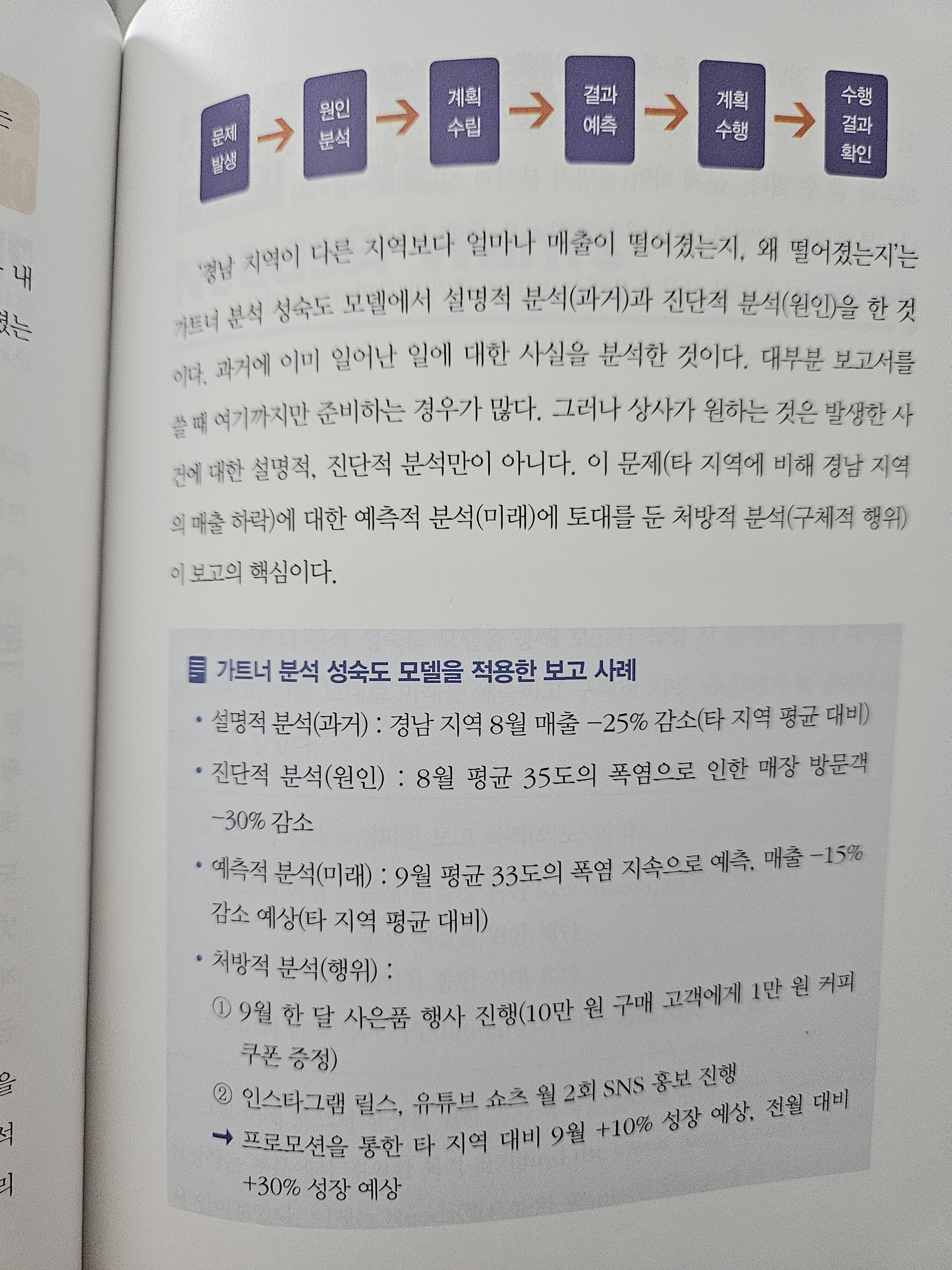 p.85 본문에 나오는 '경남 지역이 다른 지역보다 얼마나 매출이 떨어졌는지, 왜 떨어졌는지' 와 같은 요청은 회사에서 내가 가장 많이 처리하는 업무이다. 사실 가트너 분석 성숙도 모델에서 '설명적 분석(무엇이 발생했는가?) + 진단적 분석(원인은 무엇인가?)' 까지는 마케팅, 기획, 구매 등 업무 담당자들이 더 정확하게 알고, 누구나 수치적으로 파악해볼 수 있는 부분이다. 데이터 분석가라면 '예측적 분석(어떻게 될 것인가?) + 처방적 분석(무엇을 할 것인가?)' 까지 분석적 방법론과 근거를 가지고 들어가야 능력치로 볼 수 있을 것 같다고 많이 느낀다. 왜냐면 월별 매출 변화는 누구나 뽑을 수 있는 자료니까. 거기서 변수를 설정하고, 가중치를 고려하여 변수가 미치는 영향 또는 원인 발굴, 예측까지 가야 분석 스킬 향상이 되지 않을까는 늘 하는 고민이다.
