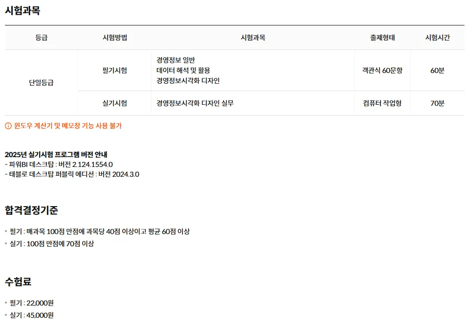 보통 데이터 관련 자격증인 SQLD/SQLP, 빅데이터분석기사, ADSP/ADP 는 ‘데이터 자격검정’ 사이트에서 보게 된다. 경영정보시각화능력은 대한상공회의소에서 시행하는 시험이다. 필기, 실기로 이루어져있으며, 실기는 툴 중 파워BI와 태블로를 고를 수 있다.
