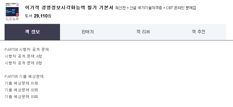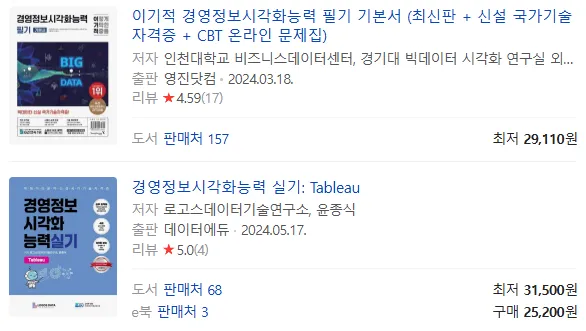 필기는 이기적 경영정보시각화능력 필기 기본서, 실기는 경영정보시각화능력 실기; Tableau란 책을 사서 했다. 필기는 당시에 나온 책이 몇 개 없었던 것으로 기억하고, 다른 시험을 공부하며 ‘이기적’ 시리즈를 많이 들어봐 익숙해서 고르게 되었다.